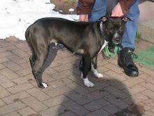 Der Menschen gegenüber sehr aufgeschlossene und freundliche Rüde ist ein American-Staffordshire-Terrier-Mischling. Er hat eine Rückenhöhe von 62 cm und wiegt 38 kg.